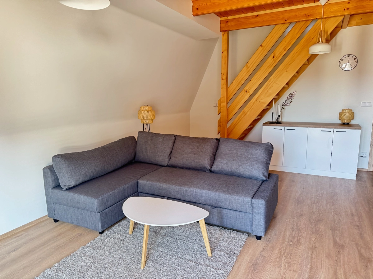 Ložnice loftového typu s krásným výhledem je vybavena manželskou postelí a pohodlnou rozkládací pohovkou. Samozřejmostí je dostatek úložného prostoru pro vaše věci.