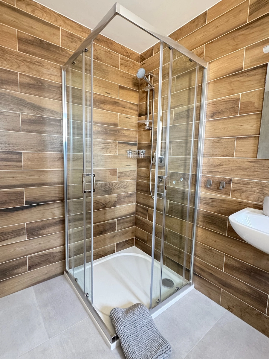 V apartmánu je moderně zařízená koupelna se sprchovým koutem, umyvadlem, fénem, toaletou a topným žebříkem.Koupelna je vybavena pračkou, která je k dispozici hostům.