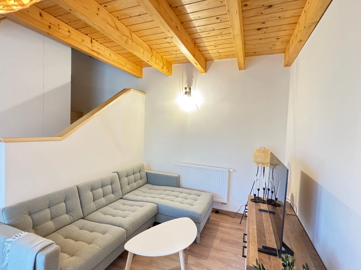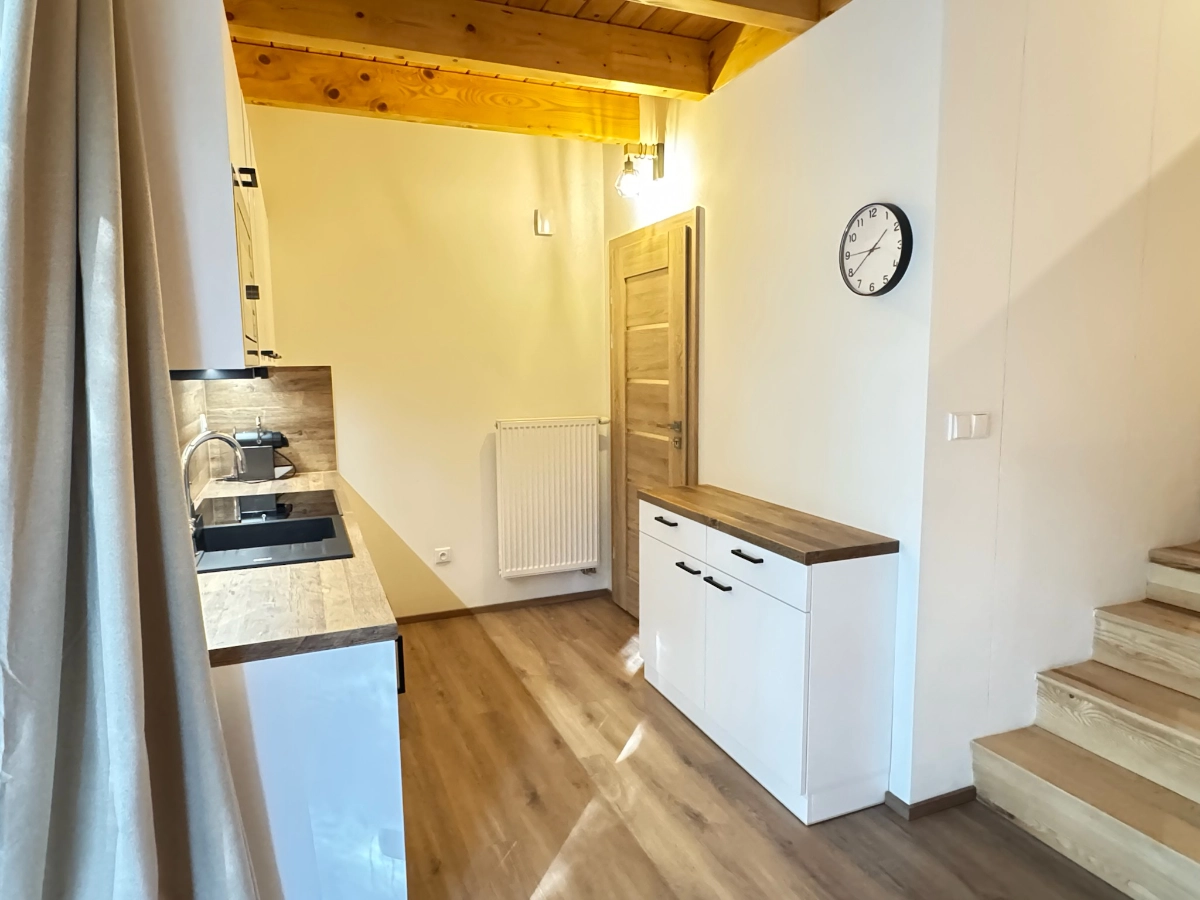 Útulný obývací pokoj spojený s plně vybavenou kuchyní je ideální pro společné chvíle. Kuchyň je vybavena myčkou nádobí, lednicí, troubou a vším potřebným pro vaření. V obývací části najdete pohodlné posezení a televizi s internetovým připojením, které vám zajistí zábavu během vašeho pobytu.