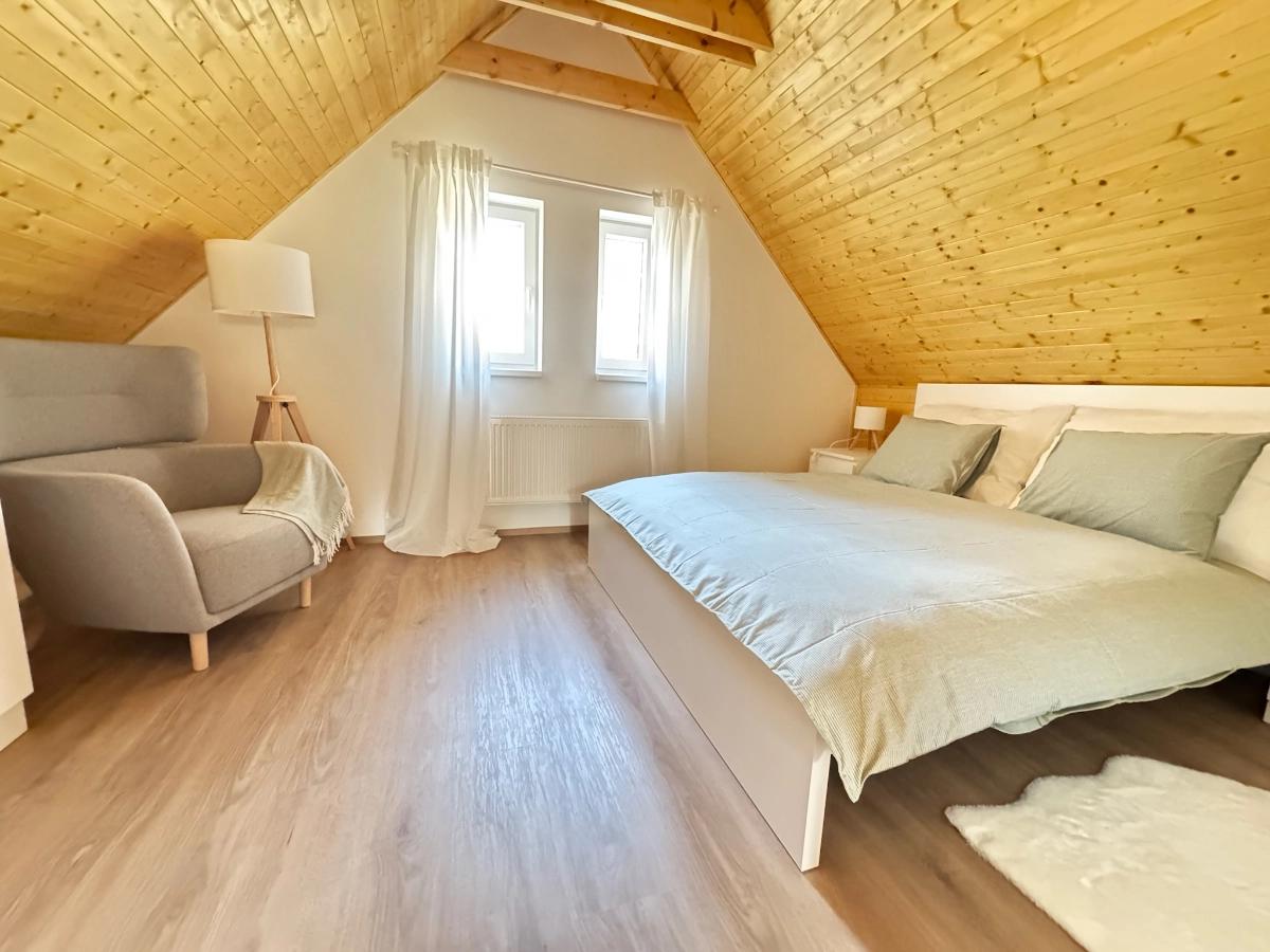 Jedna ložnice je vybavena manželskou postelí a dostatkem úložného prostoru pro vaše věci. Druhá ložnice je vybavena dvěma rozkládacími jednolůžkovými postelemi.
