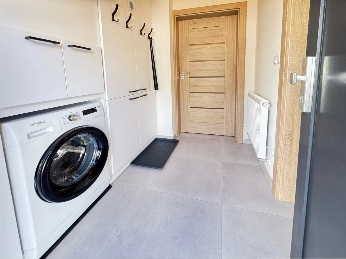 V domku je moderně vybavená koupelna se sprchovým koutem, umyvadlem, fénem, toaletou a topným žebříkem. Pračku, která je k dispozici našim hostům, najdete v přilehlé chodbě přímo proti koupelně.