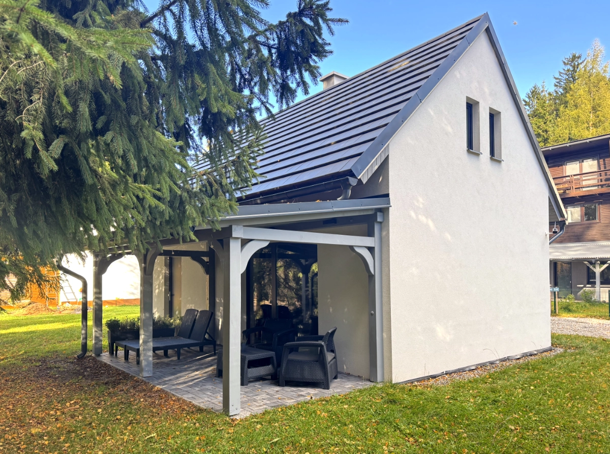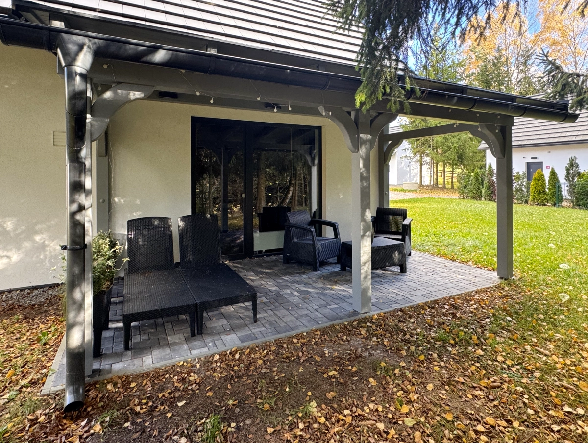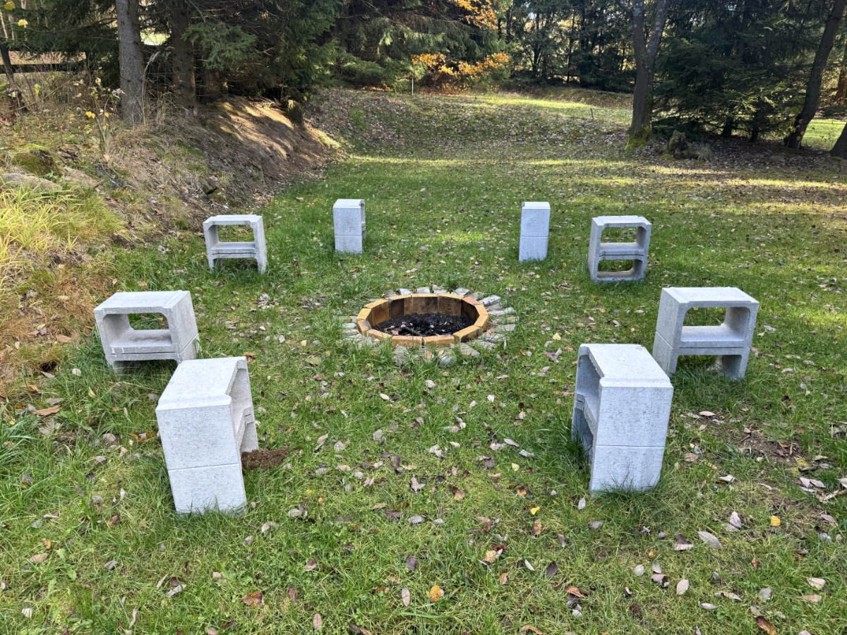 Domek stojí v malém ubytovacím komplexu a je umístěn na vlastním pozemku, kde si užijete maximální soukromí. Na zahradě je připraveno ohniště, ideální pro večerní posezení s rodinou nebo přáteli. Za domkem, s důrazem na vaše maximální soukromí, se nachází prostorná terasa s venkovním posezením, kde můžete relaxovat a vychutnávat si čerstvý vzduch.